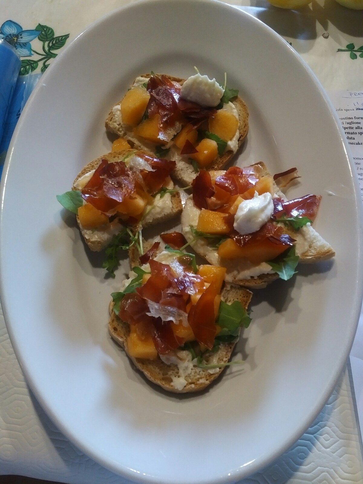 Crostino con fromaggio fresco, rucola,, melone, e prosciutto