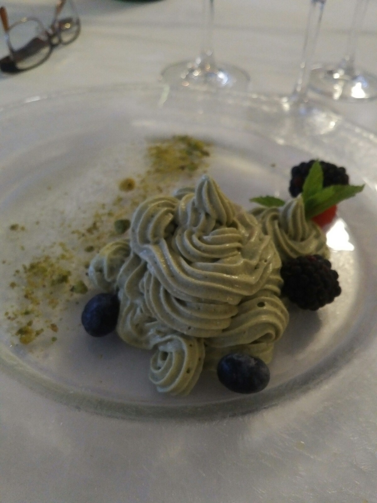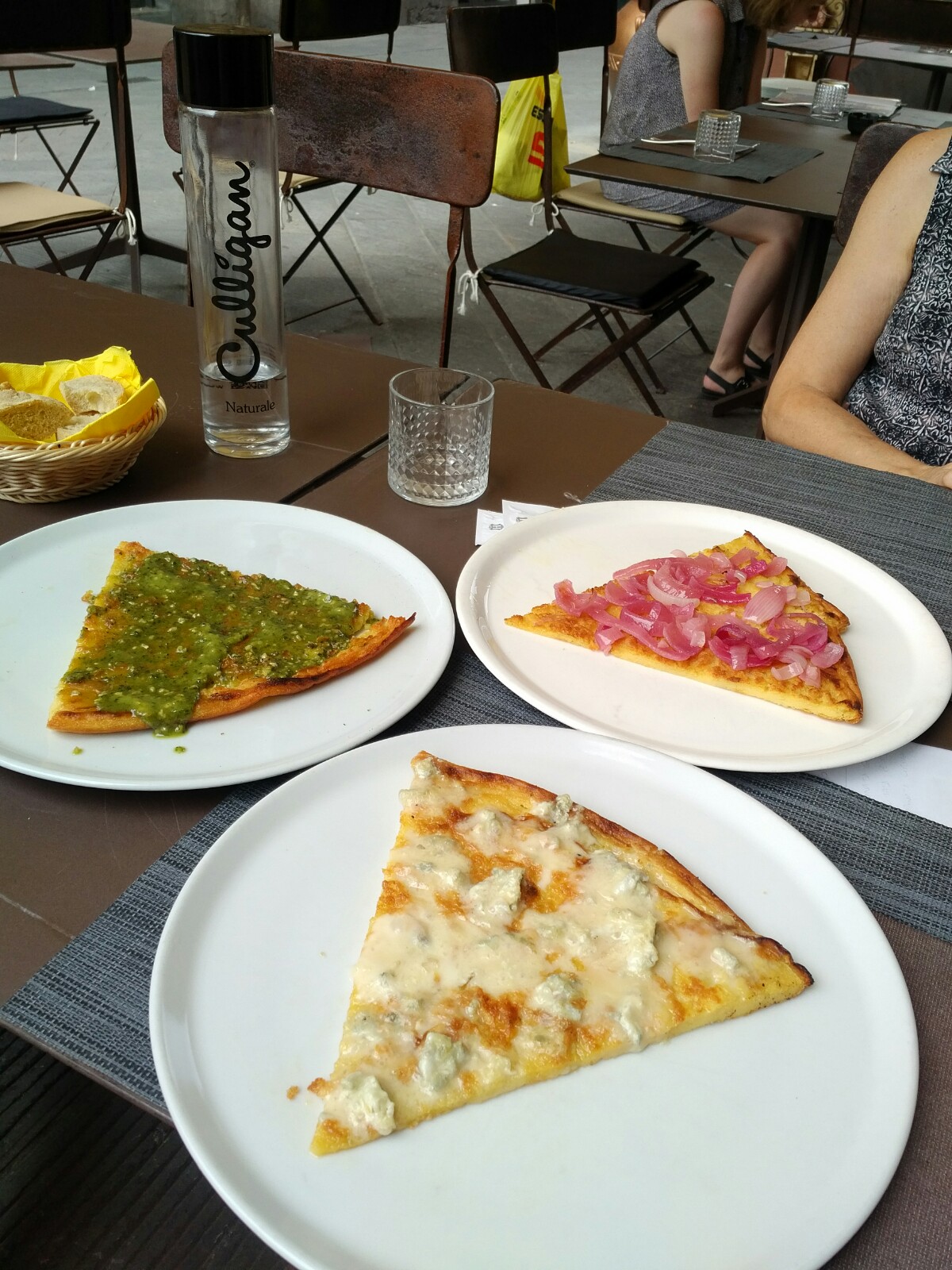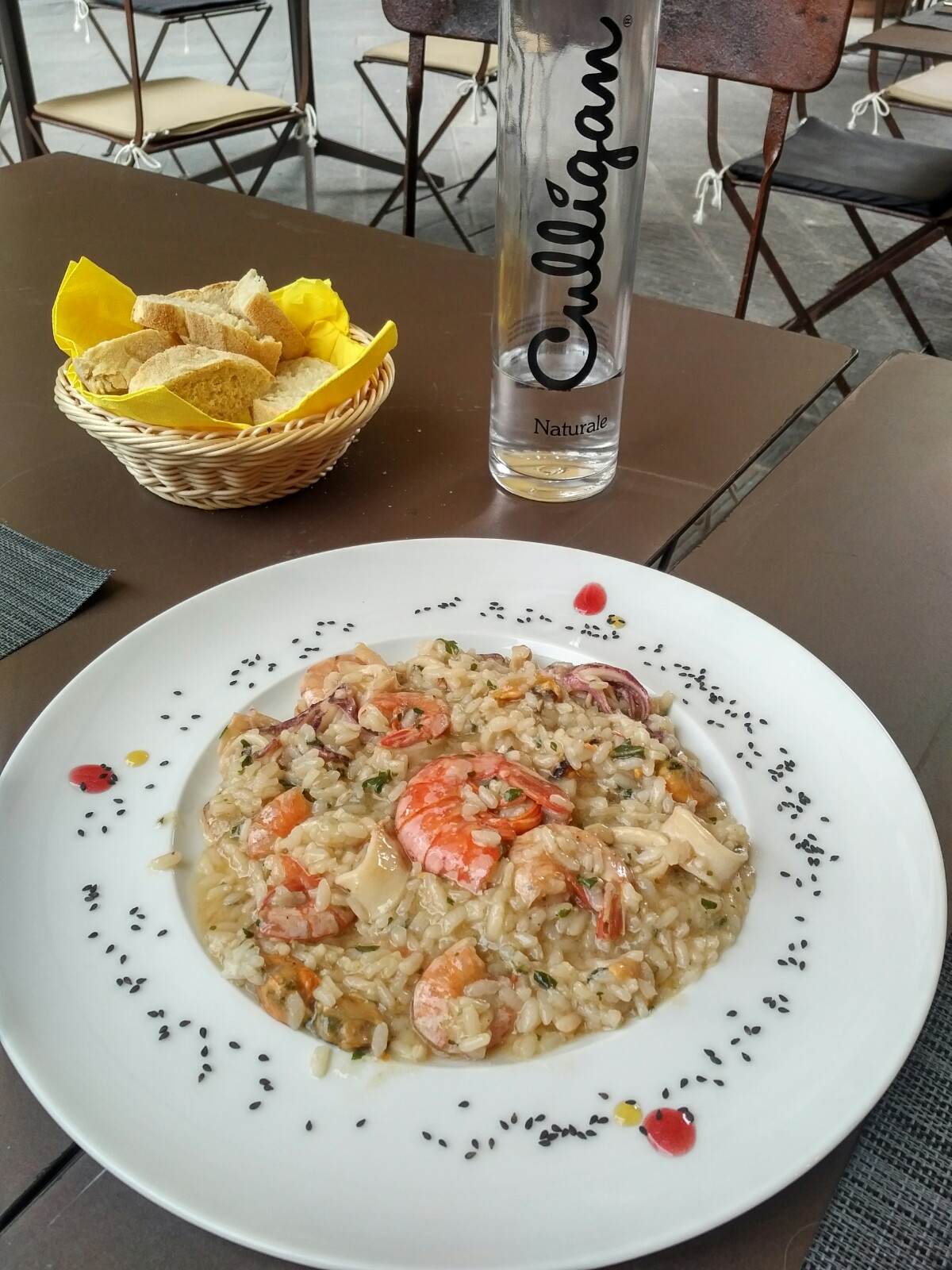 Seafood risotto and Farinata; blue cheese,onion and pesto.Yum