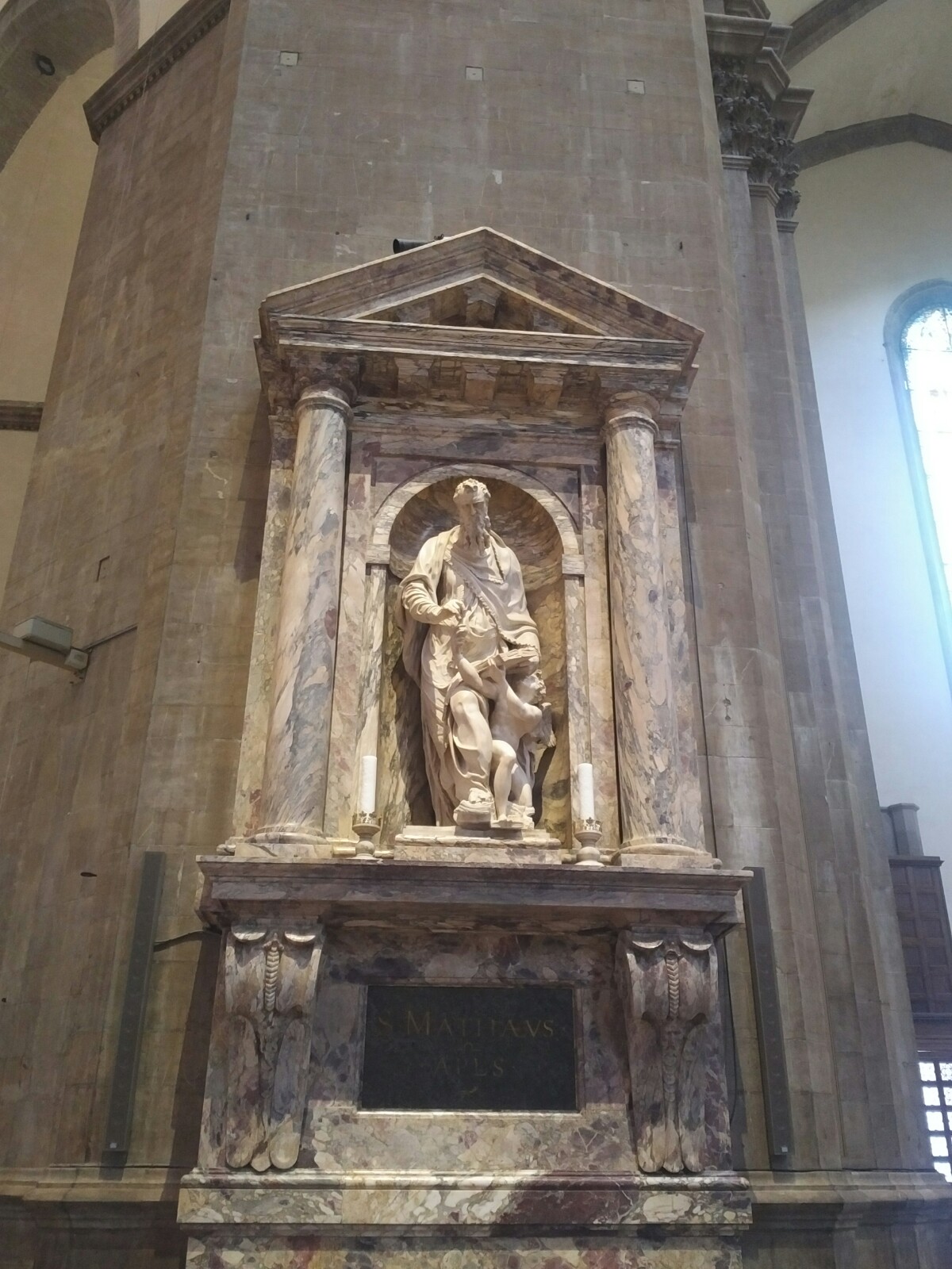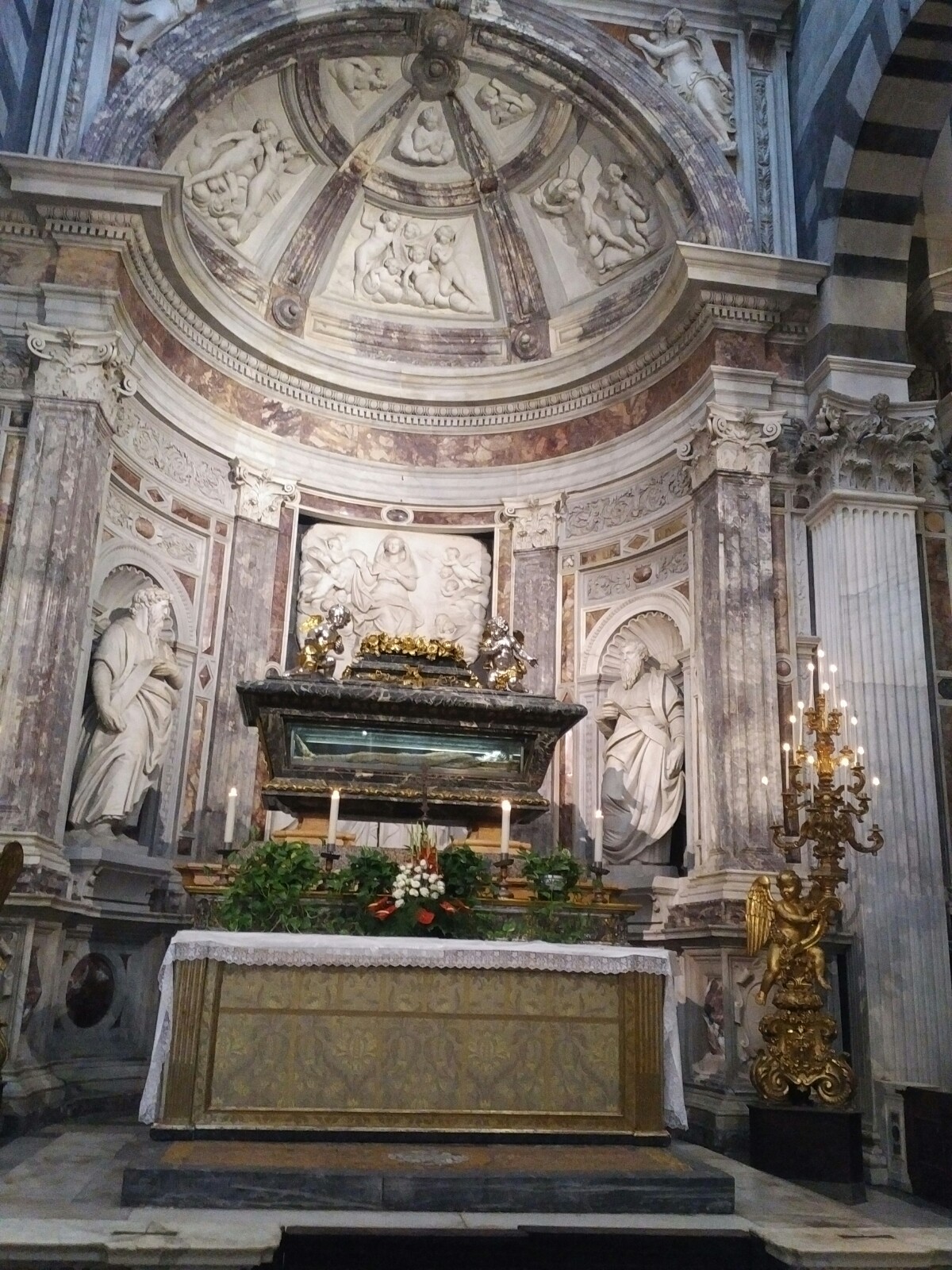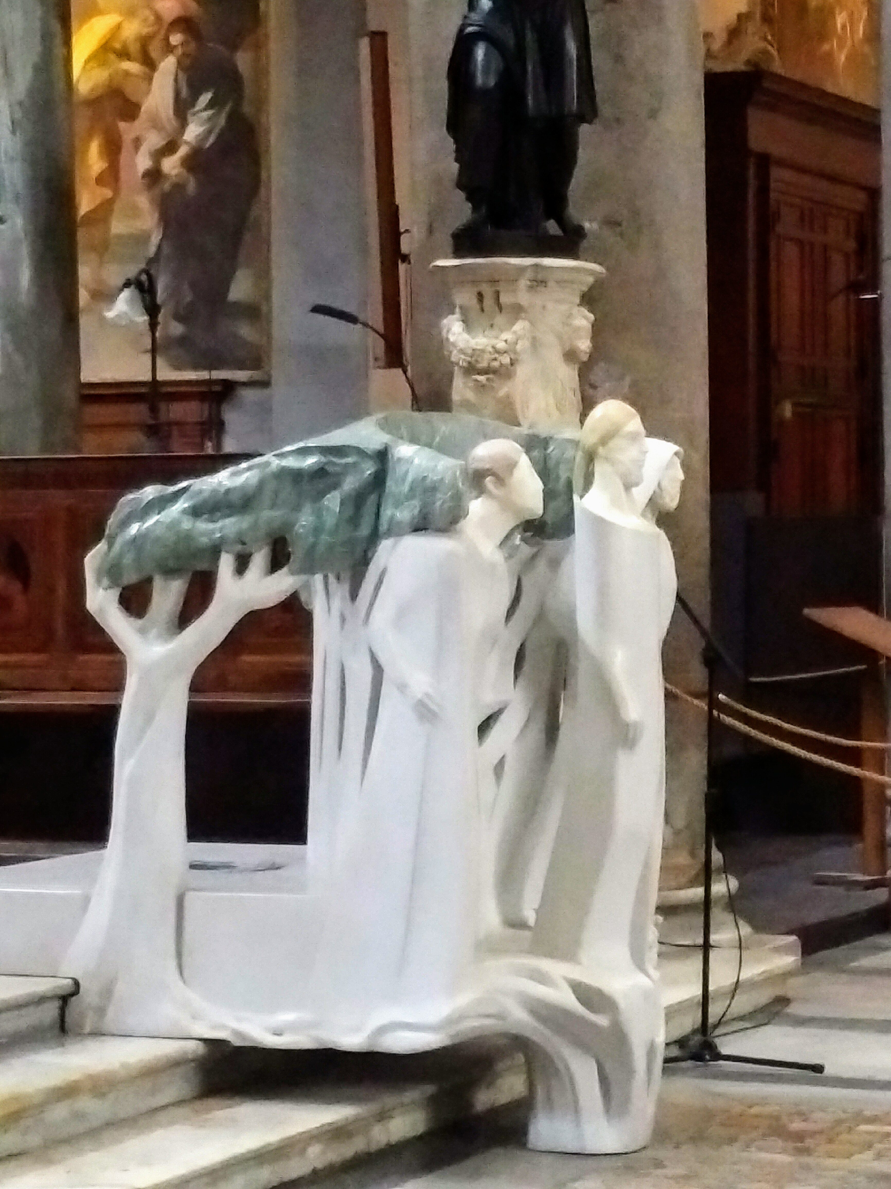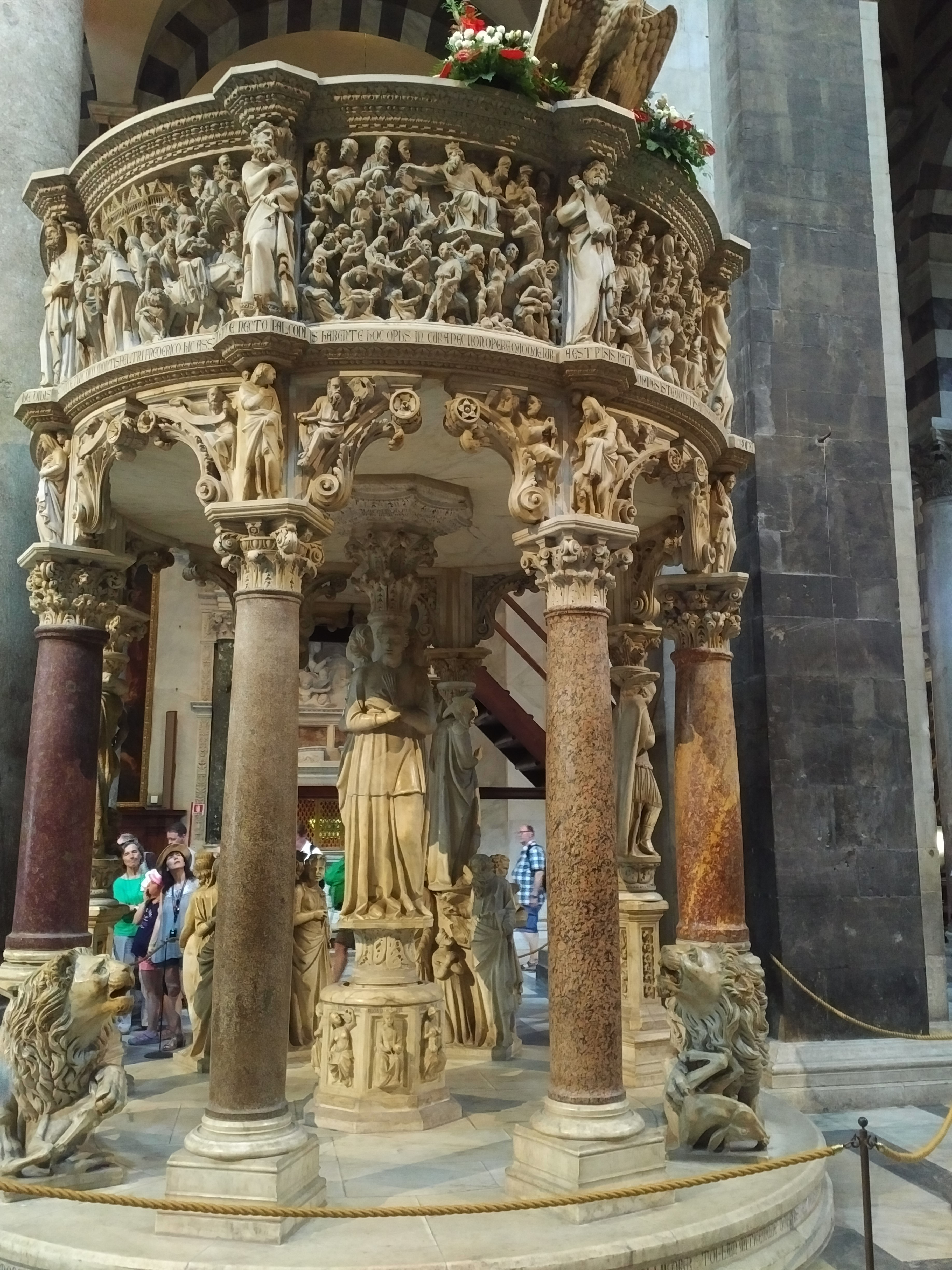 The eight-sided pulpit inside the cathedral symbolizes the virtues in Gothic sculpture